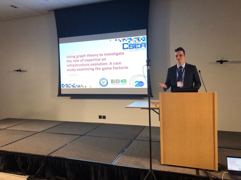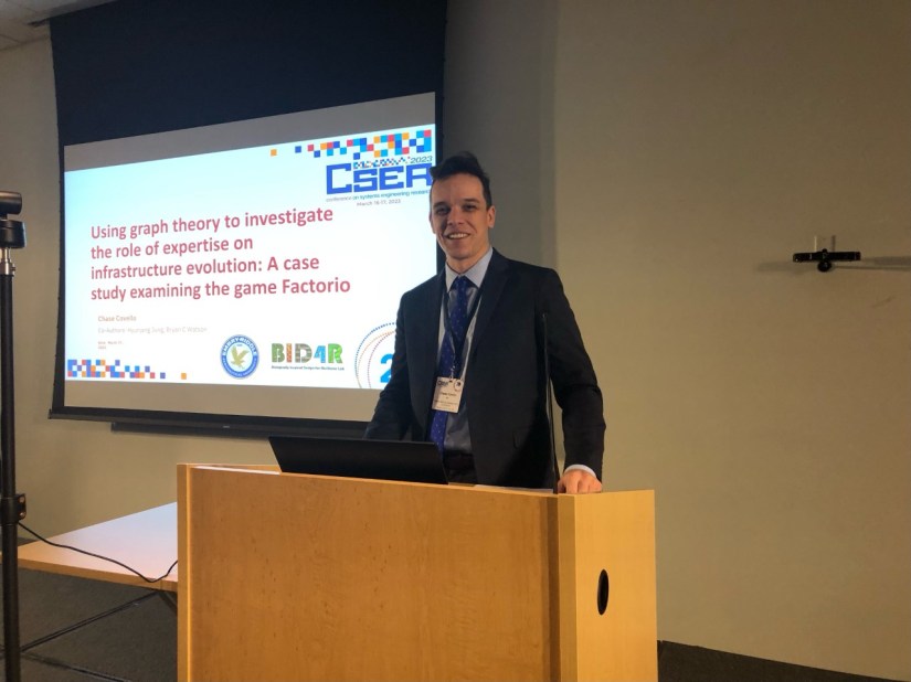 Members of the BID4R Lab at the Conference on Systems Engineering Research (CSER) at the Stevens Institute of Technology. Chase Covello presented his paper: “Using Graph Theory to Investigate the Role of Expertise on Infrastructure Evolution: A Case Study Examining the game Factorio” to a well attended session.