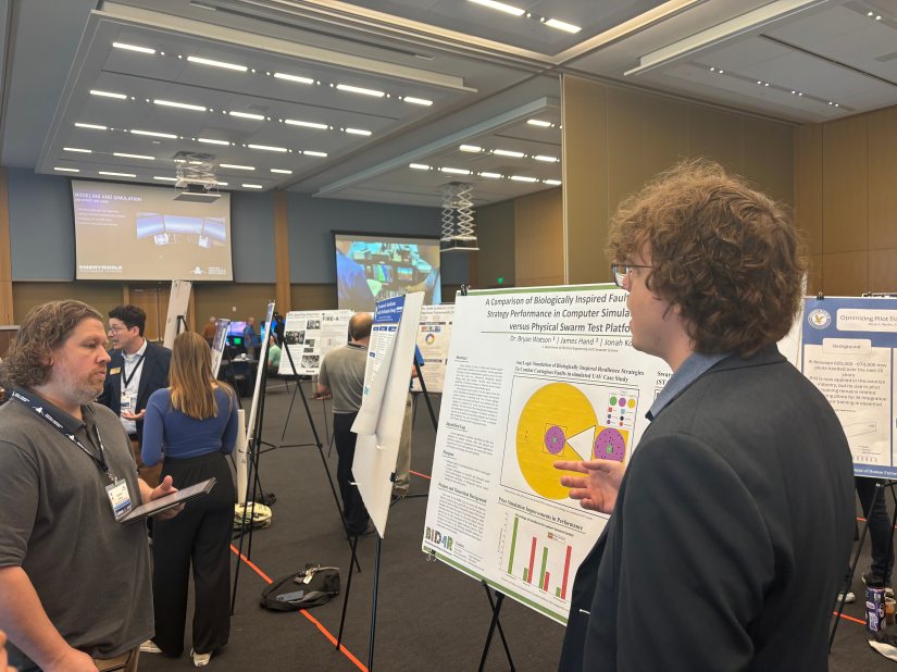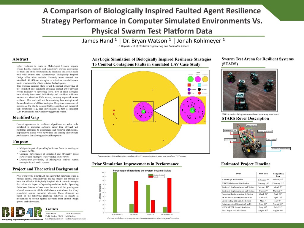 BID4R’s contribution to this year’s cyber rodeo was an overview of STARS, or the Swarm Test Arena for Resilient Systems. Specifically, it presented a poster on “A Comparison of Biologically Inspired Faulted Agent Resilience Strategy Performance in Computer Simulated Environments Vs. Physical Swarm Test Platform Data.” The poster outlined the current work the BID4R lab is doing with the STARS platform and demonstrated one of our swarm units. – Jonah Kohlmeyer